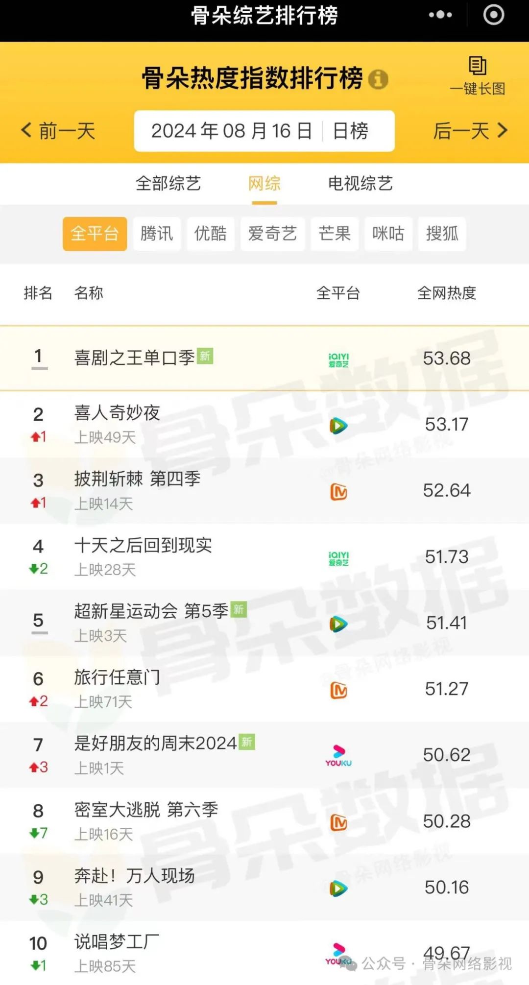 再从综艺方面来看,今年综艺市场稳中向好的发展趋势要有一部分归功于爱奇艺对新综艺的不断发掘。根据骨朵整理的暑期档热播综艺TOP10,仅有爱奇艺上榜的三部独播综艺均为新综。其中,《喜剧之王单口季》创新出喜综赛道的新表达,优秀的选手共聚一堂上演“巅峰对决”,大大避免了脱口秀舞台的同质化。