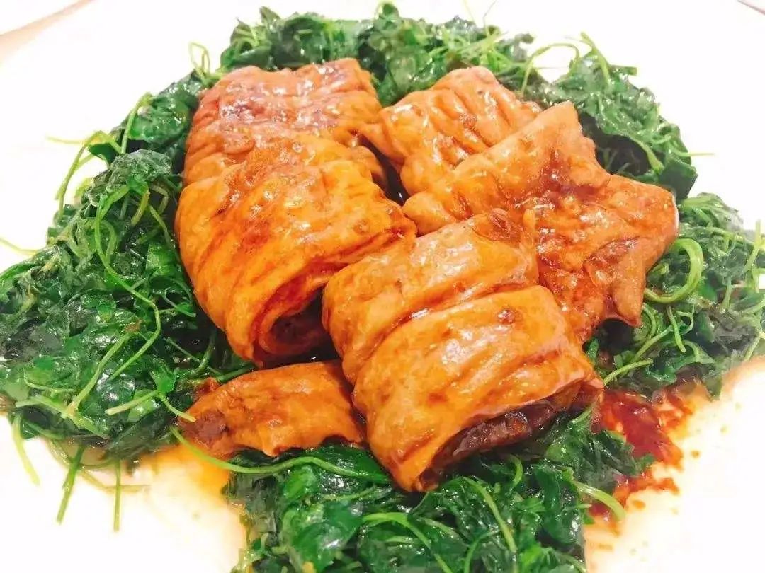 功德林的素鸭味道是一绝,豆腐皮做的很薄,带点汁水很下饭,烤麸、豆干酱汁很是入味,难怪宋庆龄、萧伯纳吃过都不吝赞誉!9