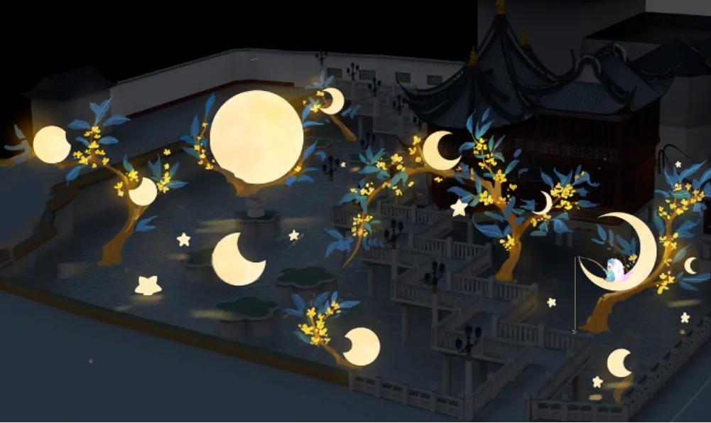 2024豫园·仲秋月神游以“心有光华,人生无缺”为主题,延续《山海经》神话背景,从《道德经》中提出的“大成若缺”及庄子的系列中式哲学思想,旨在带领游客从“月圆月缺”中品悟完美与不完美之间的“常态哲学”。活动期间,豫园商城将被仲秋主题灯组所点亮,中心广场的“月印万川,处处皆圆”,以“镜”与“月”为设计元素,巧妙利用镜面折射,呈现“一月普现一切水,一切水月一月摄”之境;九曲桥的“四时有序,万物有时”灯组,则依托于《山海经》中常羲沐月的神话传说,将十二轮明月落于桥畔,让游客感受月圆月缺的光泽,体悟“人生自有闪光时”的哲思;凝晖路则将再现龙年灯会上“一夜鱼龙舞”的盛景,无数璀璨繁星悬挂星空,营造“流星拂晓空”的绽放之美;黄金广场打造创意灯组,邀游客们一同“举勺挖金月”。除了现场丰富的灯组展现及演出以外,更有丰富的隐藏式玩法,多种趣味互动打卡装置,以及超多惊喜的盲盒等待探索。