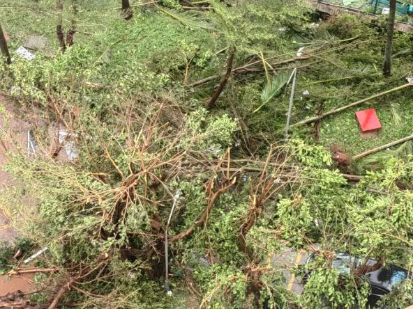 被大风吹折断的椰子树和倒伏的垃圾桶(央广网记者 付美斌 摄)