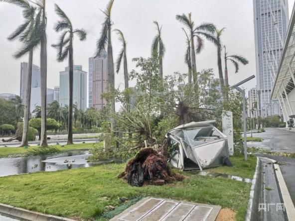 海口会展工场外,倒伏的树木将保安亭压坏(央广网记者 付美斌 摄)