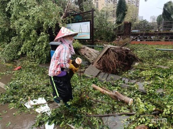 园林工人正在清理倒伏的树木(央广网记者 付美斌 摄)