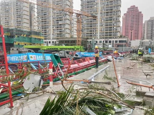 在建工地上工人正在清理倒塌脚架(央广网记者 付美斌 摄)