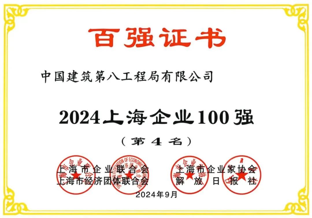 9月3日,上海市企业联合会、上海市企业家协会、上海市经济团体联合会和解放日报社在中国金融信息中心召开2024上海百强企业新闻发布会,揭晓了2024上海企业100强榜单,中建八局名列第4位,较去年晋升4位。完美履约