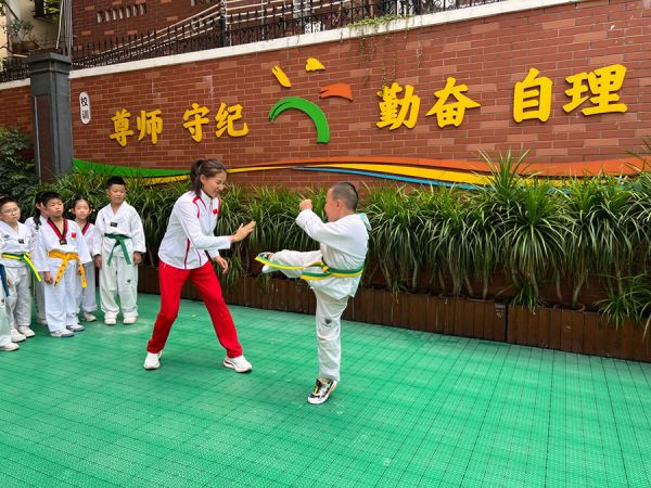 越秀区小北路小学,巴黎奥运会跆拳道女子49公斤级银牌得主、广东籍奥运健儿郭清和学生现场“过招”