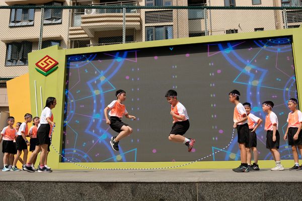 越秀区八旗二马路小学,学生合作跳绳,感受运动乐趣