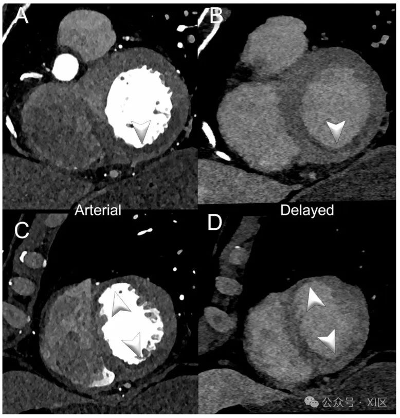 图3 心脏/冠状动脉能谱PCCT示例,显示亚急性左心室缺血。图中展示了一位患有近期急性心肌梗死的患者,其右冠状动脉和左前降支冠状动脉领域的能谱CTA。A,B显示左心室(LV)基底短轴视图,分别为动脉/血管造影相位(A)和延迟相位(B);C,D显示LV心尖部位的相同信息。箭头指示多个LV段的低灌注(早期和延迟)。延迟相位采用了能谱采集和40 KeV重建。扫描使用商用全身双源PCCT扫描仪(NAEOTOM Alpha,Siemens Healthineers)进行,层厚为0.2/0.4mm,重建间隔为0.1/0.2mm,FOV 140–160mm,源轴向重建的分辨率矩阵为512 × 512/1024 × 1024,使用Bv48-60卷积核和最大强度的量子迭代重建(QIR 4);扫描采用回顾性心电门控和管电流调制。显示的空间分辨率为0.1/0.20mm。
