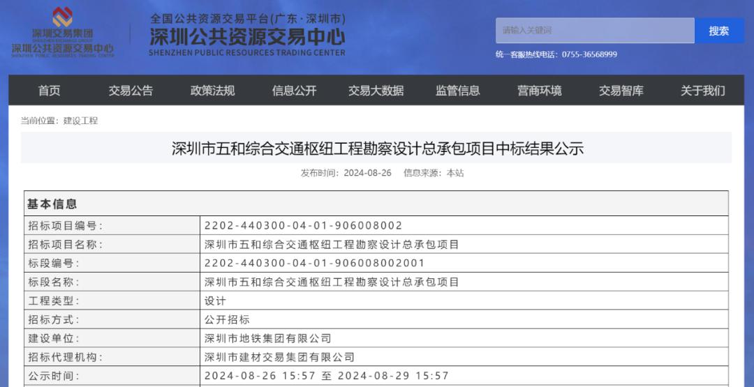 近日,深圳市地铁集团有限公司公布工程勘察设计总承包项目中标结果,深圳市五和综合交通枢纽工程进入新阶段,本次勘察设计总承包工作内容包括工程勘察、前期工程设计、初步设计、施工图设计、BIM技术应用服务、配套专题、施工配合及验收等工作,计划工期为2024年10月31日—2026年12月31日。