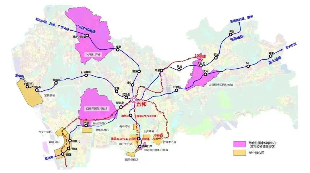 深圳市五和综合交通枢纽据公开资料显示,深圳市五和综合交通枢纽位于龙岗区西部,布龙路与五和大道交叉口。深圳市五和综合交通枢纽在既有深圳地铁5、10号线基础上,引入在建深大城际、深惠城际和规划的广深中轴城际,是一座五线换乘的城际枢纽。
