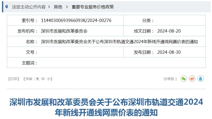 《深圳市轨道交通2024年新线开通普通车厢线网票价表》可点击下方卡片并关注【深圳之窗】公众号,在聊天对话框发送【地铁】即可获取。