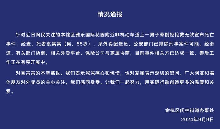 针对近日网民关注的本辖区雅乐国际花园附近非机动车道上一男子晕倒经抢救无效宣布死亡事件,经查,死者袁某某(男,55岁),系外卖配送员,公安部门已排除刑事案件可能。经街道、有关部门协调,相关外卖平台、保险公司与家属协商,目前事件相关方已达成一致,善后工作正在有序开展中。对袁某某的不幸离世,我们表示深深痛心和惋惜,也对家属表示深切的慰问。广大网友和媒体朋友对外卖员的关心关注,我们感同身受。让我们一起努力,用实际行动创造更多的温暖和关爱。