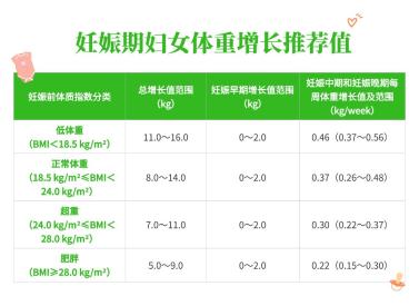 对于孕妇来说,应在孕前维持适宜体重、孕期合理增重、产后减少体重滞留。妊娠前体重应保持在18.5 kg/m⊃2;≤BM<24.0 kg/m⊃2;。妊娠早期的体重增长值范围应保持在0~2.0kg范围内,中期和晚期应保持在0.26~0.48范围之内。