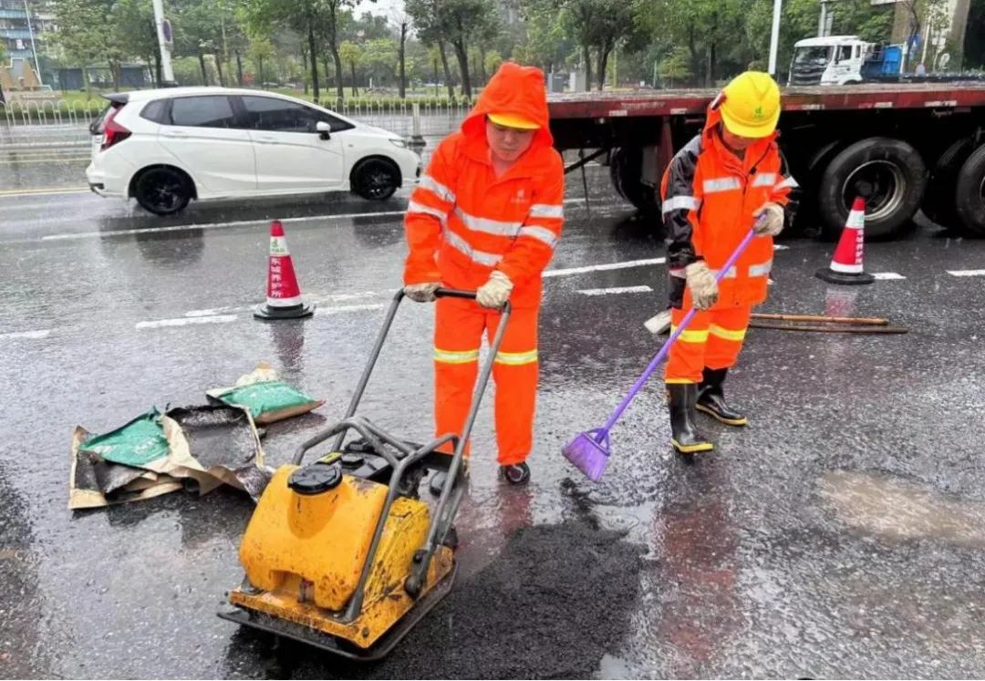 推广水反应型高耐久沥青修补料应用。近年来,特别是在雨季汛期,养护所在沥青路面应急临时性修复中普遍推广采用水反应型高耐久沥青修补料,该材料可在雨天照常施工,倒料前无需吹干积水,可带水修补,且不需要添加粘层油,加水压实后可立即开放交通。新材料的应用实现了路面病害随时发现、随时修复,有效保障路面行车安全。