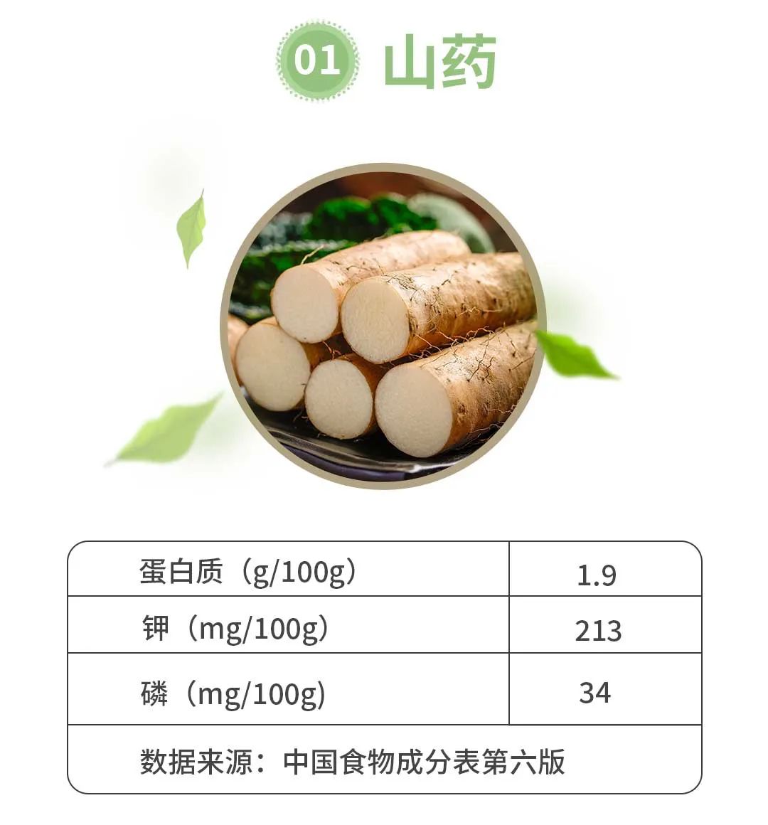 推荐理由:1.蛋白含量为1.9g/100g;是天然低蛋白食物,另外山药的淀粉含量高,可以提供的能量也不少,因此日常也可以将山药替代部分普通主食来吃,尤其适合有进展风险的肾友们。