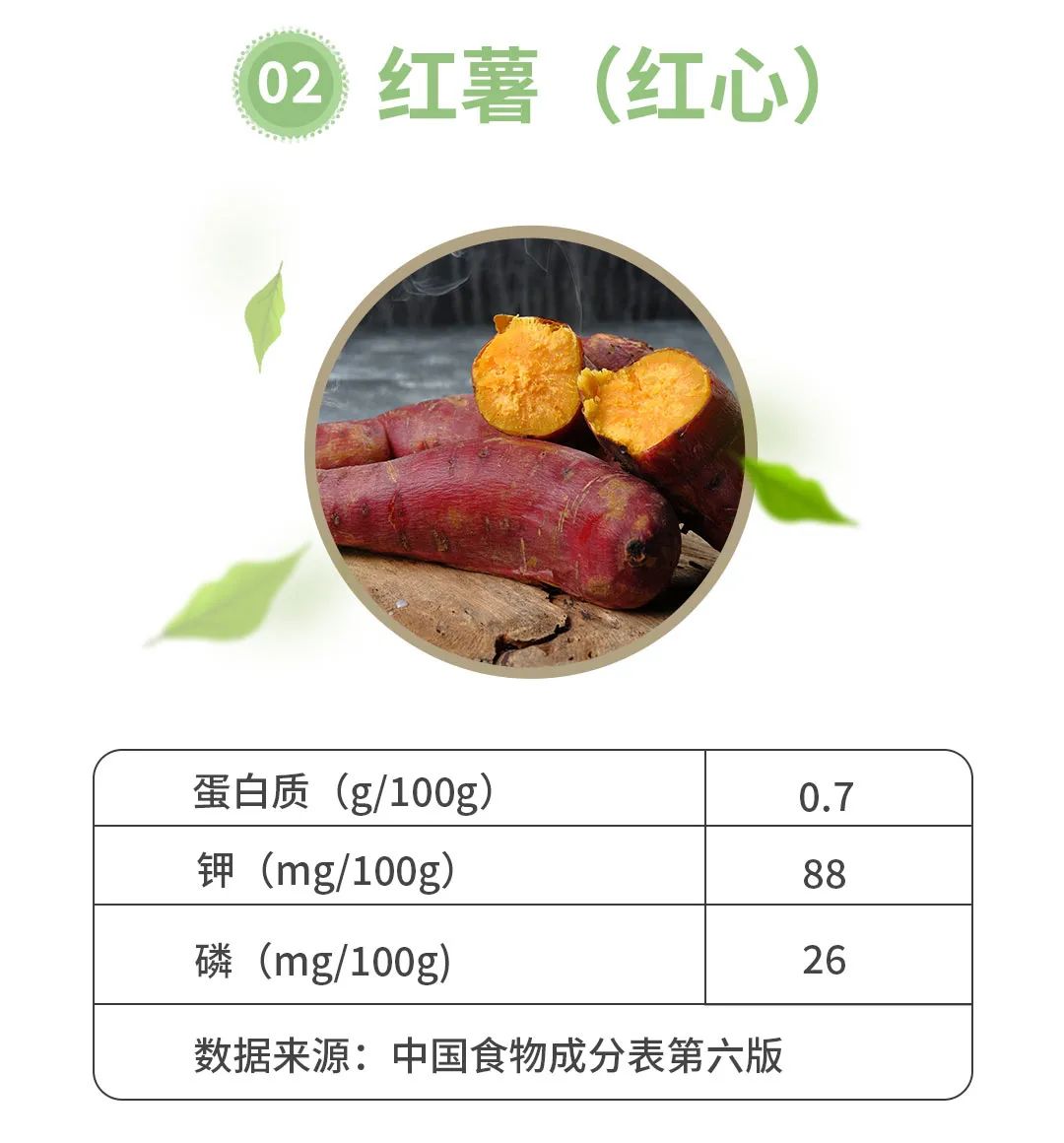 推荐理由:1.天然低蛋白主食:每天吃1-2两红薯替代部分主食,可以帮助减少蛋白质摄入量,保护肾功能。