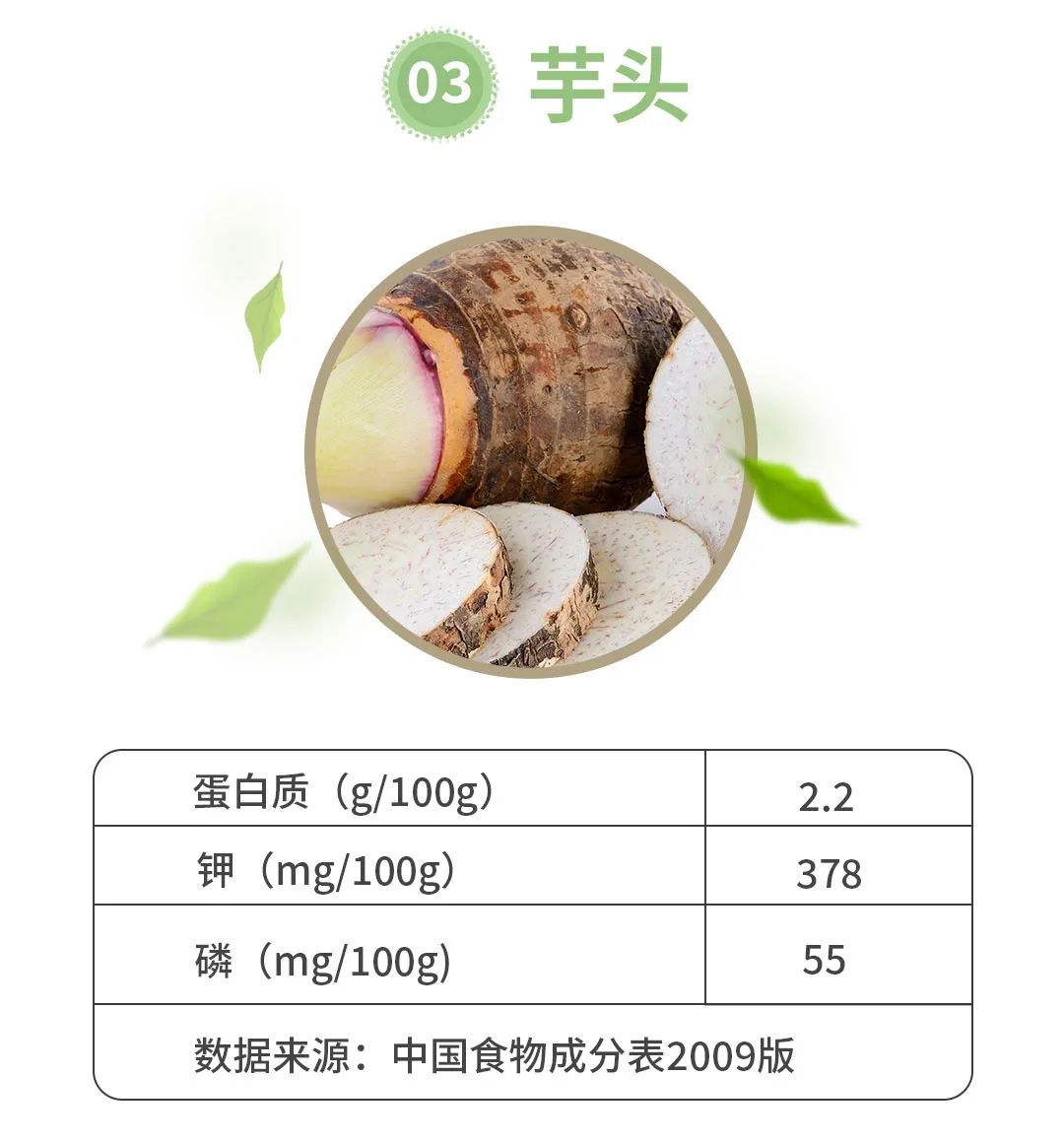 推荐理由:1.芋头中富含膳食纤维,平时多吃一些,可以帮助调节肠道菌群、改善便秘,对肾脏也具有保护作用。