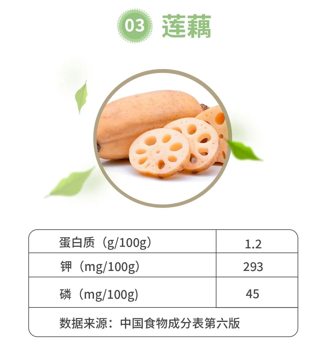 1.莲藕钾含量较高,对于肾衰竭、透析需要限钾的肾友,吃莲藕需要注意数量,每次100g即可,可以先将莲藕焯水然后再烹饪,焯水可以去除部分钾。