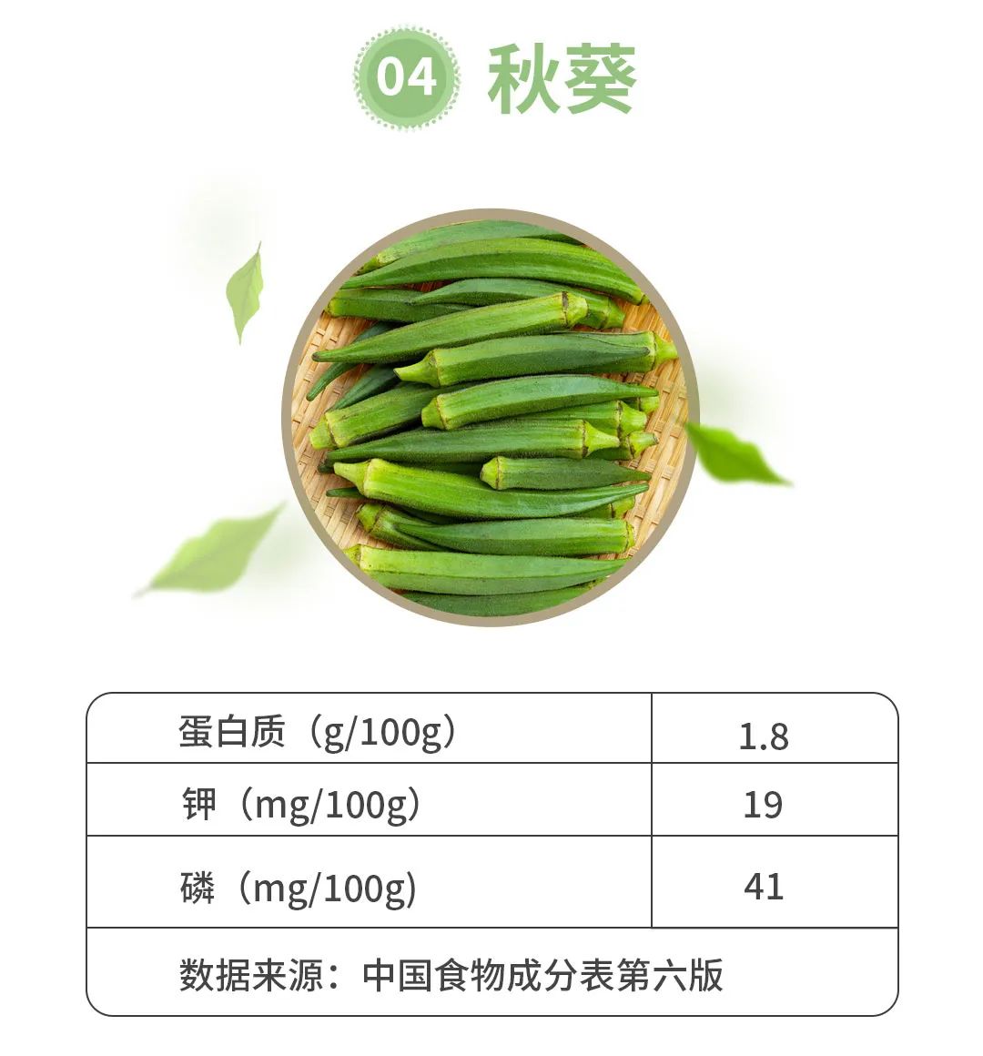 推荐理由:1.蛋白质、钾、磷含量都不高,适合所有肾友,且秋葵的热量不高,即使是有减重需求的肾友,吃它也不用有负担。
