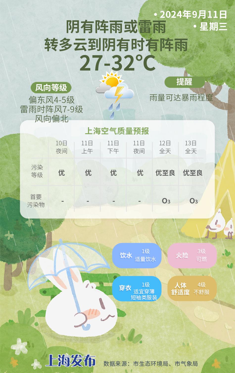 今天上午降水依然明显,仍可达暴雨。下午雨水渐止转为多云到阴为主的天气。气温在27~32℃之间。风力依然较大,偏东风4-5级,沿江沿海地区4-5级阵风6级,雷雨时阵风7-9级,风向偏北。