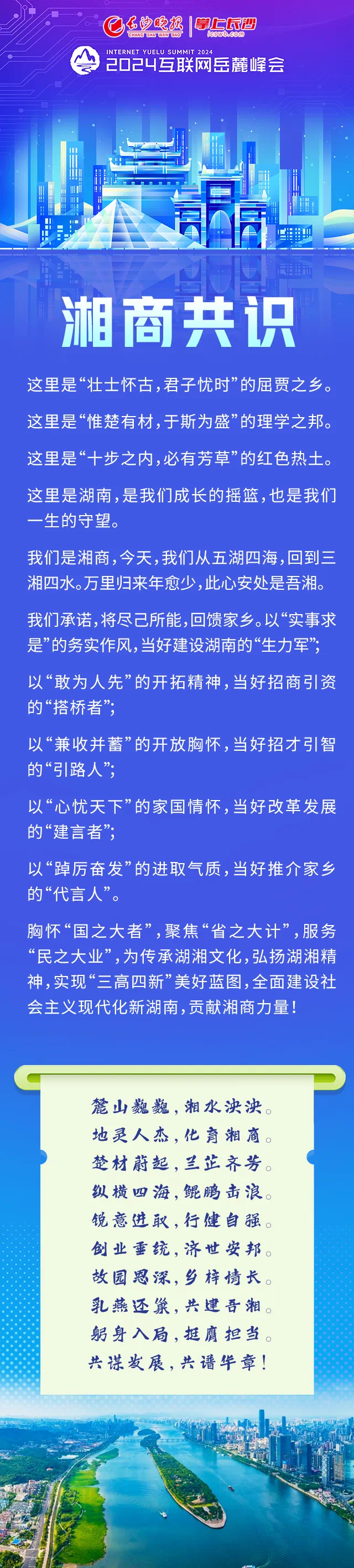“万里归来年愈少,此心安处是吾湘。”在姚劲波、李新宇、姚颂、李炜、罗灿等湘籍企业家共同宣读《湘商共识》的铿锵声浪中,激荡着广大湘商锐意进取、行健自强的创业激情,凝结了广大湘商与长沙共谋发展、共谱华章的真挚情感。