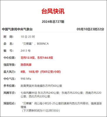 据中央气象台消息,今年第13号台风“贝碧嘉”(热带风暴级,英文名称:Bebinca;名字来源:中国澳门;名字意义:澳门牛奶布丁)已于9月10日夜间在西北太平洋洋面上生成。