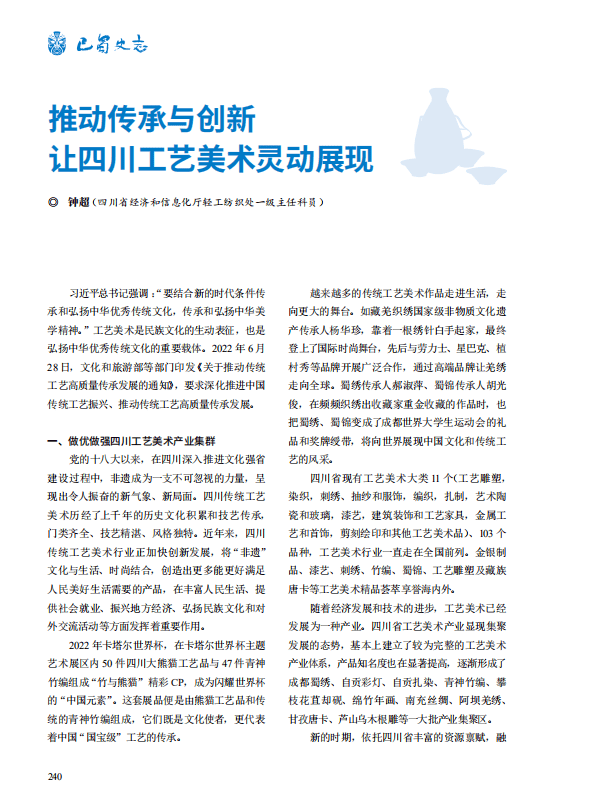 党的十八大以来,在四川深入推进文化强省建设过程中,非遗成为一支不可忽视的力量,呈现出令人振奋的新气象、新局面。四川传统工艺美术历经了上千年的历史文化积累和技艺传承,门类齐全、技艺精湛、风格独特。近年来,四川传统工艺美术行业正加快创新发展,将“非遗”文化与生活、时尚结合,创造出更多能更好满足人民美好生活需要的产品,在丰富人民生活、提供社会就业、振兴地方经济、弘扬民族文化和对外交流活动等方面发挥着重要作用。