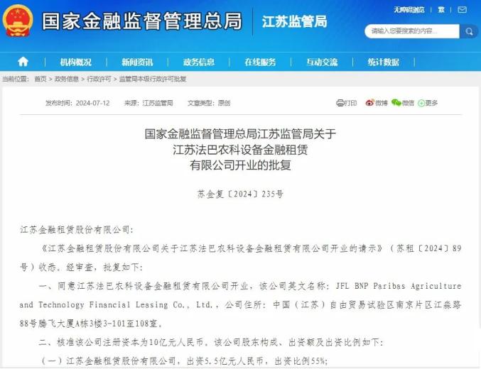 7月13日,江苏法巴农科设备金融租赁有限公司在中国(江苏)自由贸易试验区南京片区正式成立,成为全国首家获批的中外合资金租专业子公司,也是全国第一家专业服务农业和科技行业的专业子公司,注册资本10亿元。