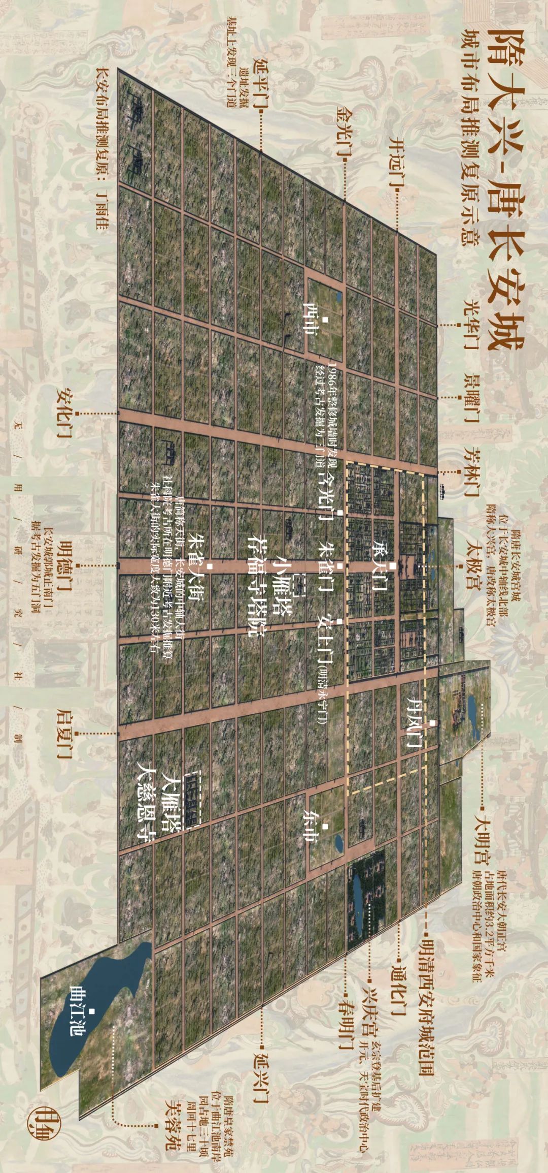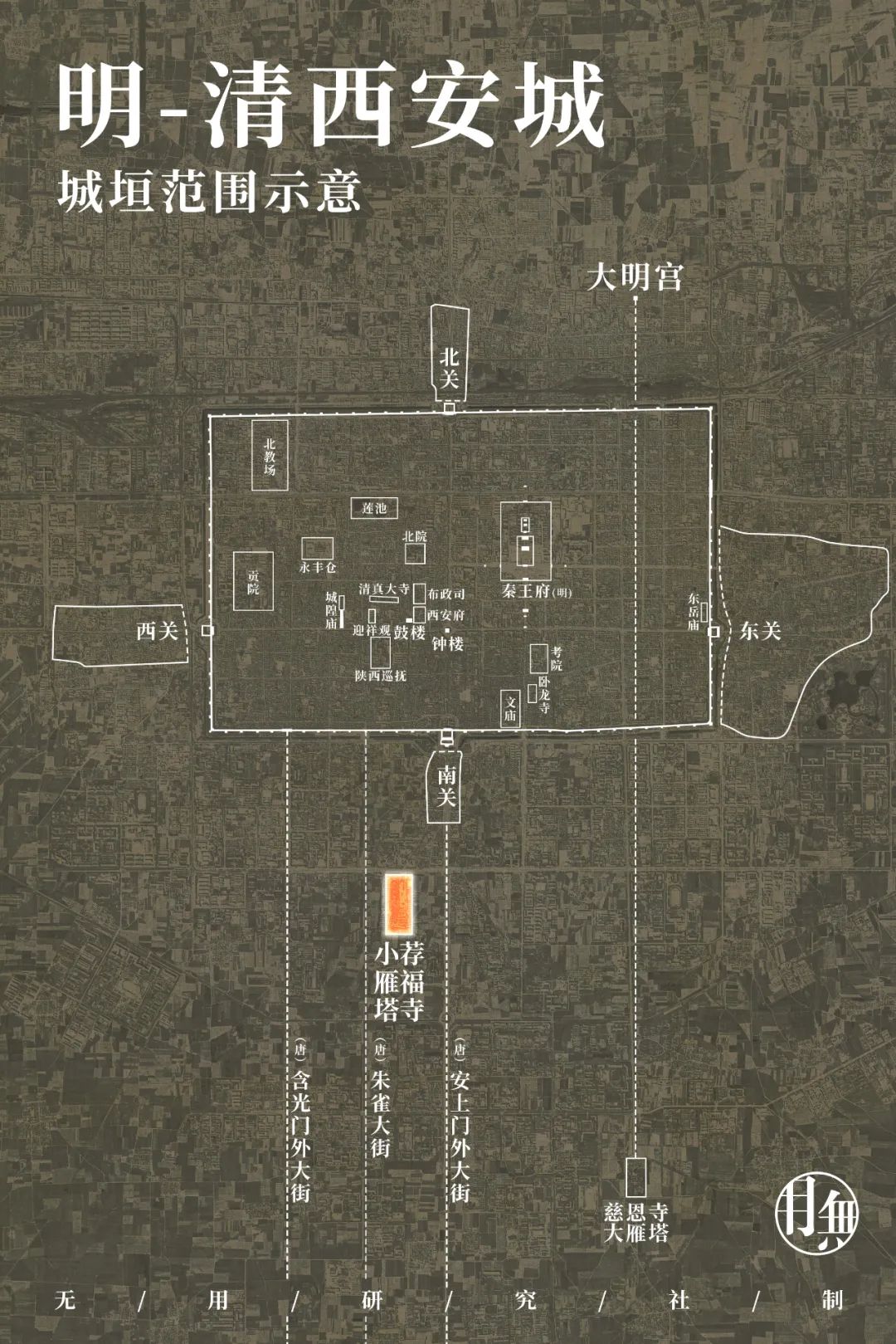 如今,最新的考古结果也显示,小雁塔所在的安仁坊坊墙西北角已出土。故而我们可以根据安仁坊坊墙转角以及长安城外郭城明德门至皇城朱雀门连线确定两个非常重要的位置信息:
