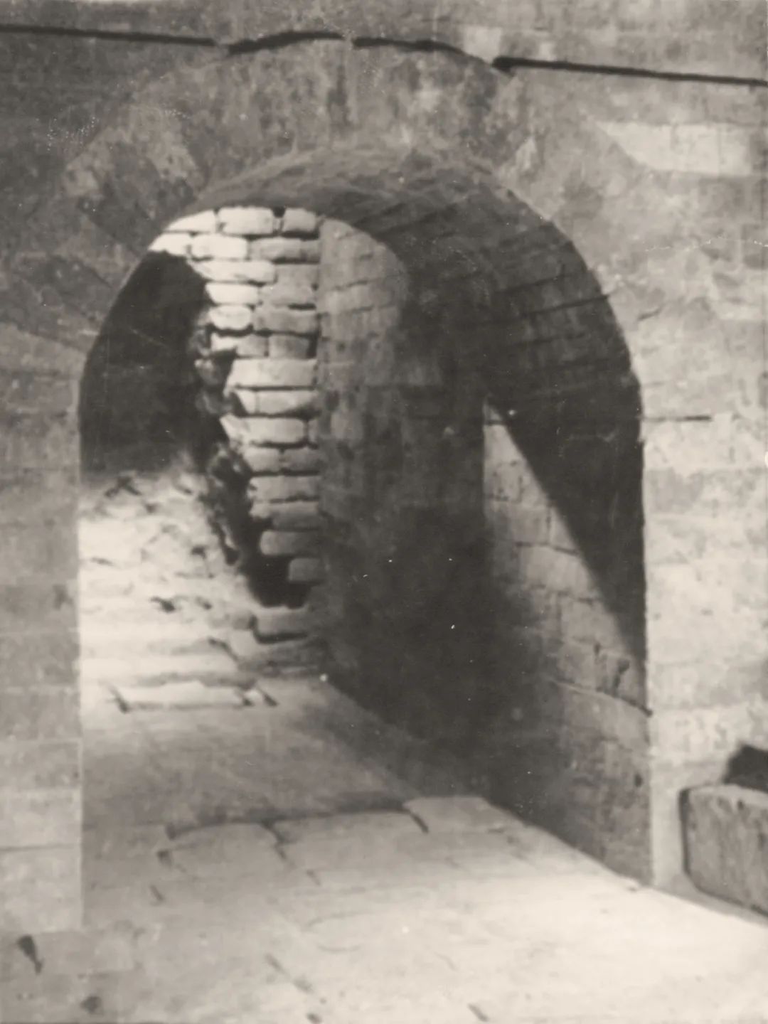 根据地宫通道走向可知,应是由南侧券门内地面通道进入。发掘报告记载,地宫为青砖砌成,由前室、甬道以及后室组成,三部分相连,整体坐北朝南。