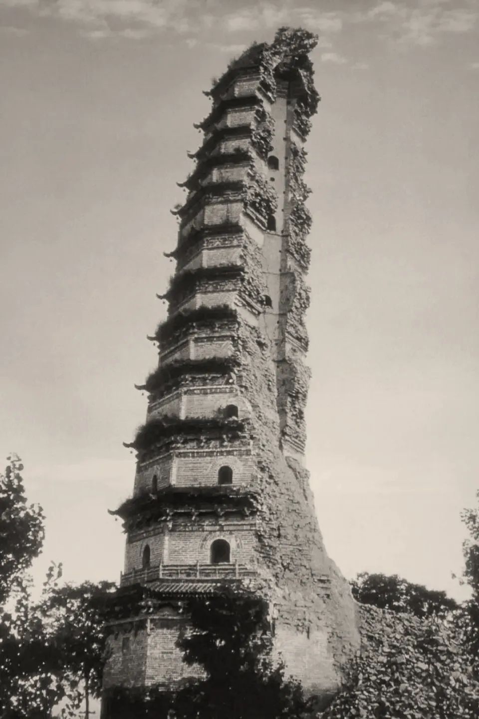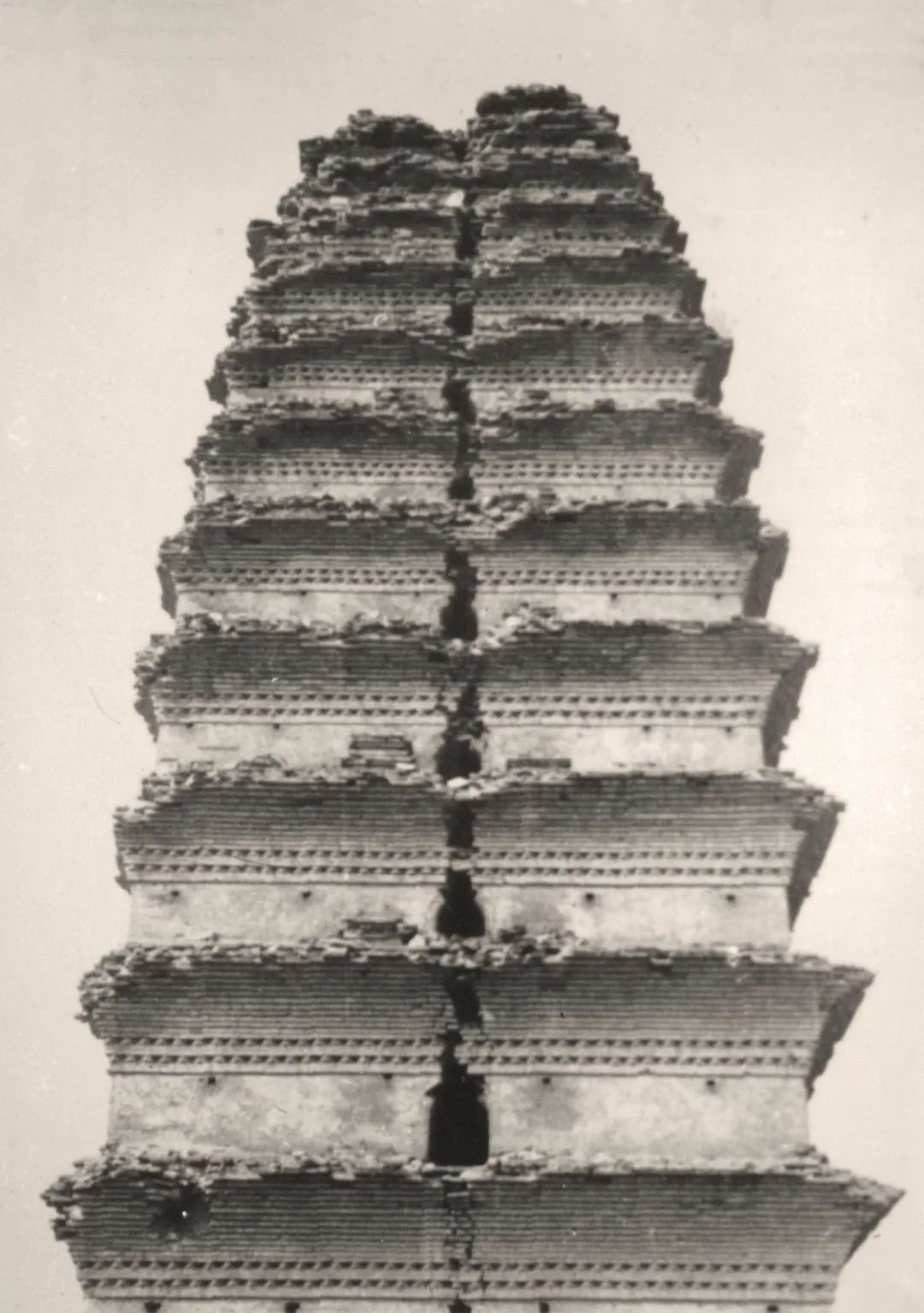 从老照片中我们能看出,两侧开裂的塔体仍旧向中部倒斜,如同“人”字两撇向上合于中部,或有地震波导致的摇晃使得两侧塔体又向中部挤压也不是没有可能。