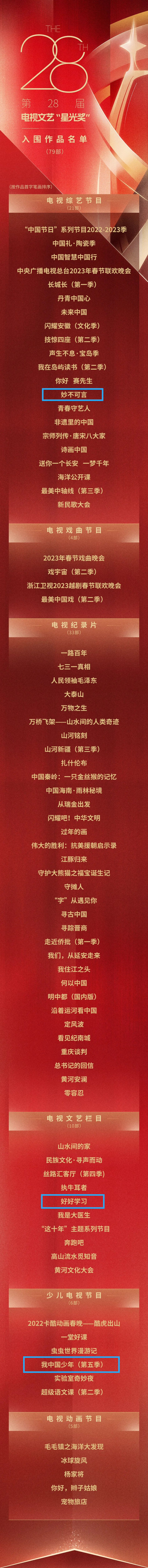 《好好学习》入围 “电视文艺栏目” 。这是一档原创文化类思政节目,秉承“由文化及精神,打造一堂电视化的铸魂育人“全民大思政课”的定位,以党的二十大报告中强调的“弘扬以伟大建党精神为源头的中国共产党人精神谱系”为指引,聚焦中国共产党人精神谱系(第一批)的46种精神,通过丰富多元的表现形式,对中国共产党人精神谱系进行深入详细地解读。让“大思政课”融入丰富多元的文艺表达之中,带大众在趣味互动中深刻感受到46种伟大精神的感染力,根植于心、践之于行,将思政课讲得有深度、有力度、有温度。