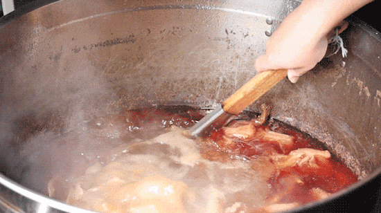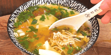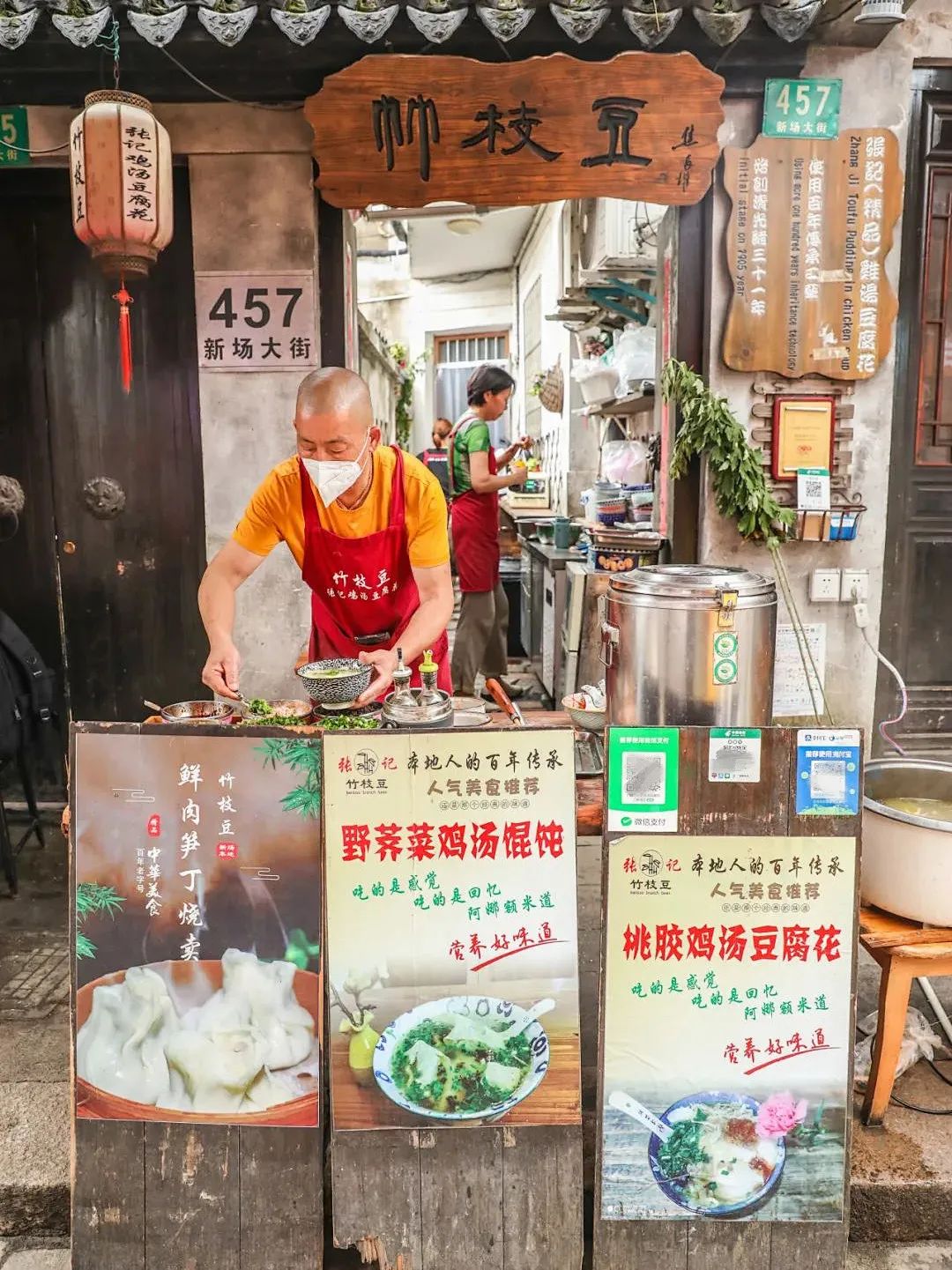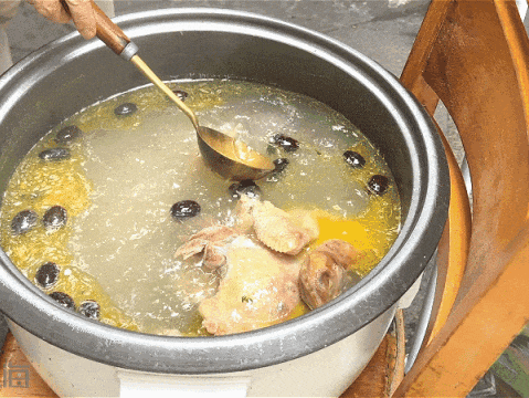 老板对这份传承的非遗手艺很是上心,每天坚持凌晨2:30起床煮鸡汤、磨制豆花。散养土鸡汤一天要熬煮好几锅,大锅里的鸡汤色泽金黄,一看就是有些硬功夫在的。豆花一天则要准备五六锅,先盛汤,再舀上满满一碗豆花,看着就色香诱人。