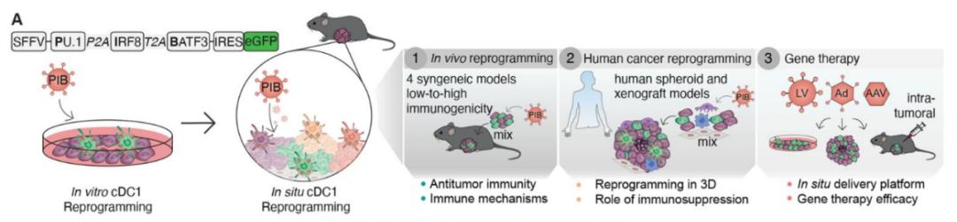 研究团队在此前发现,三个转录因子PU.1、IRF8和BATF3的组合(简称PIB)就能够将肿瘤细胞重编程成为1型常规树突状细胞(cDC1)。
