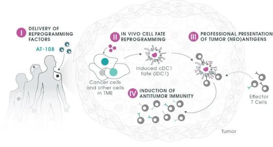 Asgard的主要项目AT-108疗法可以恢复肿瘤的免疫原性,重塑肿瘤微环境并启动全身抗肿瘤反应。通过使用无复制能力的腺病毒载体来递送专有的转录因子,AT-108可以将肿瘤和其他肿瘤微环境中的细胞重新编程为一种稀有而强大的树突状细胞——1型常规树突状细胞(cDC1)。