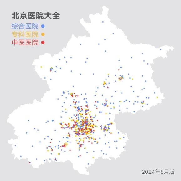 如此多的医院,服务着全市乃至全国的患者,是北京作为医疗资源中心的基础。为了尽量全面地展示北京的医疗资源,我们尝试绘制了这篇北京医院完整图鉴(注:本文数据收集于2024年8月,考虑到医院开关情况,本文收录的医院总数和分类数与2023年北京卫健委统计数字不一致)。