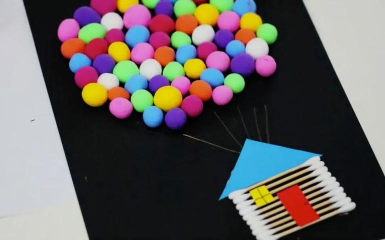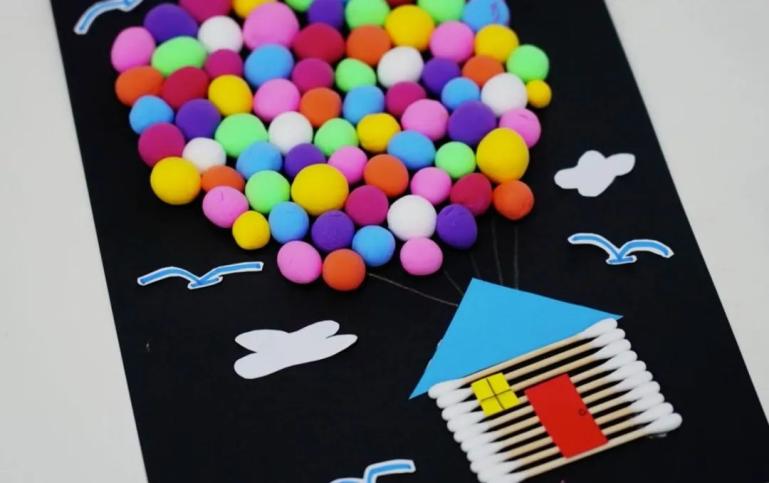 最后,你可以再剪几朵云朵和小鸟放在气球的周围。会飞的小屋就制作完成啦~制作视频
