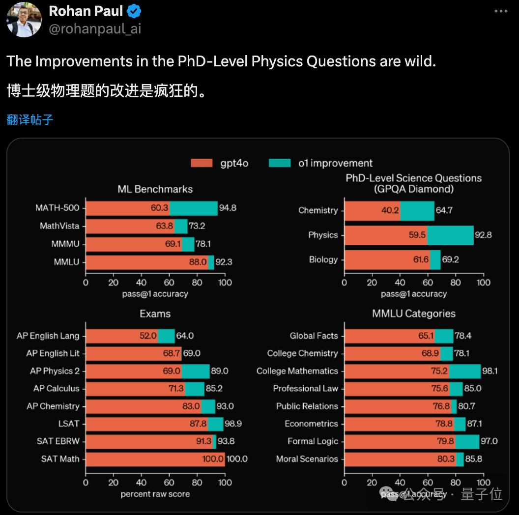 与GPT-4o相比,o1在数理化生、英语法律经济等各种科目都有不同成绩改进。