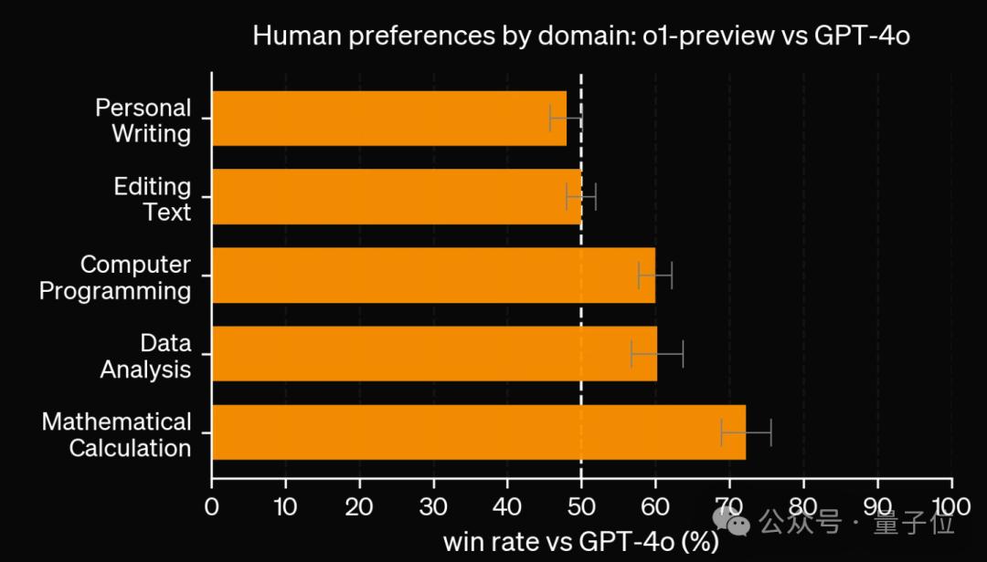 除了考试和学术基准之外,团队还评估了人们对o1-preview与GPT-4o在开放问题上的偏好。在数据分析、编码和数学等推理密集型类别中,o1-preview明显优于gpt-4o。