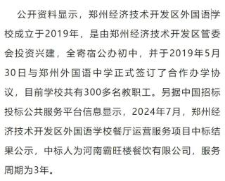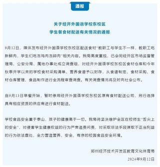 9月12日,有网友发视频称,河南省郑州经济技术开发区外国语学校存在教师和学生饮食待遇不公的情况。9月13日,郑州经开区官微发布了郑州经济技术开发区教育文化体育局关于经开外国语学校东校区学生餐食材配送有关情况的通报。