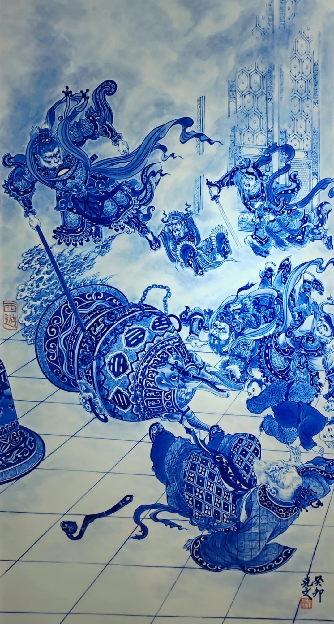 西游元素大型瓷板画。一件件无与伦比、无比精美的陶瓷作品背后,是超过百道的复杂手工工序,是经历无数创烧失败后持续耐心的投入,是无数景德镇陶瓷人对先人流传技艺传承创新的决心。这份“精诚所至、金石为开”的工匠精神,正是陶瓷传递给世界的中国理念。