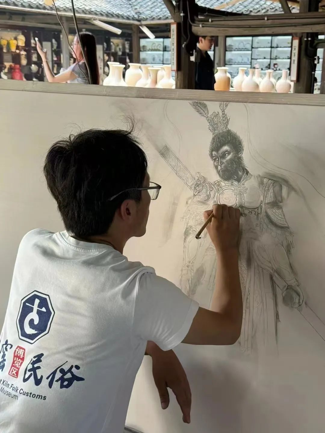 非遗传承人许克文在创作中。陶瓷文化亦是如此。在景德镇古窑民俗博览区,游客可以亲眼见证陶瓷匠人将一块块平凡的泥土,经过精心雕琢、高温烧炼,最终幻化成形态各异的《西游记》中角色。这里的每一件作品如同《黑神话·悟空》的创作团队在打磨作品般,都同样蕴含着“匠人”的心血及对传统文化的敬畏。