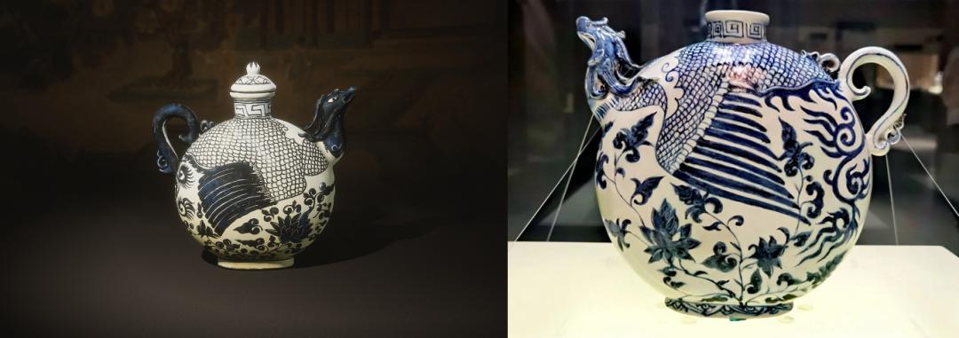 游戏道具“椰子酒·十年陈”与原型《元代景德镇窑青花凤首扁壶》。图源景德镇文旅作品以昂起的凤首为流,以卷起的凤尾为柄,凤身绘于壶体上部,双翅垂至两侧,“青花凤首扁壶”采用多种制作工艺,壶流为模制成型,壶柄以捏塑成型,再合为一体,设计构思可谓别具匠心。