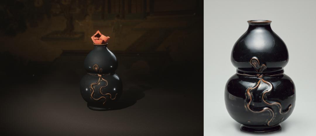 游戏道具“聚珍伏虎丸”与原型《明代黑釉葫芦瓶》。图源景德镇文旅在景德镇,“齐天大圣”已被“七十二般变化”幻化成“悟空”系列瓷雕、瓷画、瓷板、瓷盘、瓷杯,每一件作品中都透着一个故事或一个主题,活灵活现,妙趣横生。