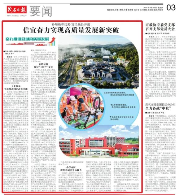 今年上半年地区生产总值272.81亿元,同比增长3.1%;总投资14亿元,信宜市公共型农产品集散集配加工中心建设项目成功签约;信宜市建设工程质量检测站改制增资为广东集信国控检测认证股份有限公司,2024年9月9日正式在港交所上市……作为茂名地区县域高质量发展的标杆,信宜市聚焦县域振兴、产业发展中的关键问题,补短板、积优势,找到了一条独具特色的富民强县高质量发展新道路。