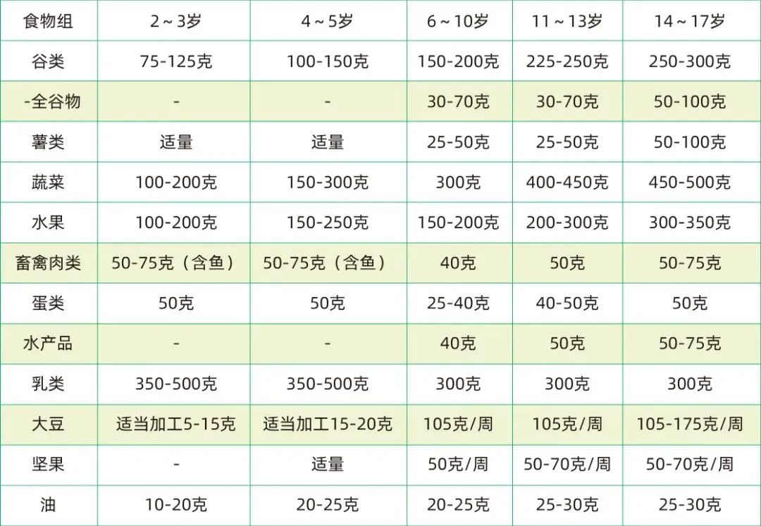 吃得够,吃的均衡摄入足够的食物是保证儿童营养充足的关键,家长可根据表一中不同年龄段各种食物的摄入量的参考,评估儿童日常饮食是否摄入不足。食物摄入不够是营养不足的主要原因,若发现孩子们某一种或多种食物摄入不足,应想办法在正餐或加餐中进行弥补。