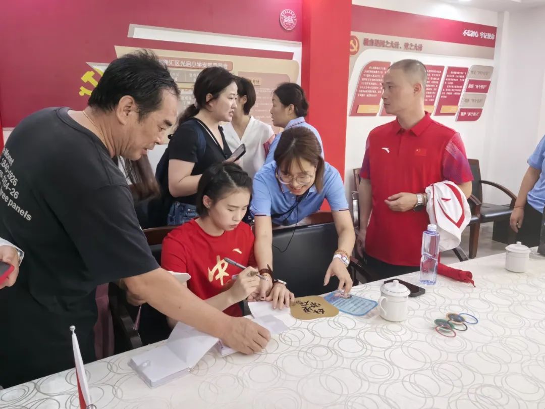 陈芋汐、吴敏霞、火亮等冠军的到来,让光启小学的学生们沸腾了。陈芋汐每走进一间教室,孩子们都激动地大喊:“芋汐姐姐好!欢迎载誉回家!”