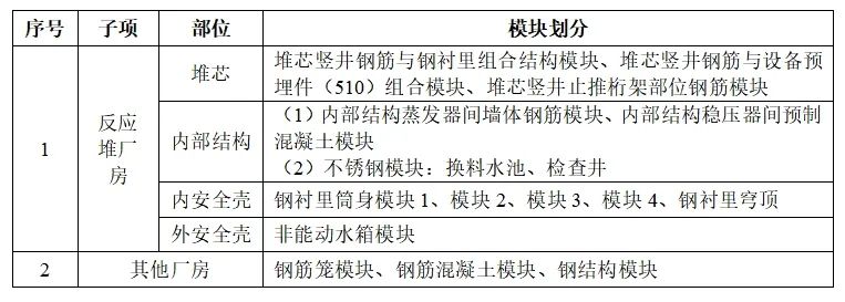 VVER-1200核岛厂房模块划分如下表所示。