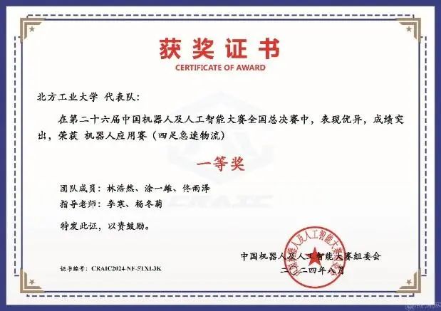 8月24日至25日,第26届中国机器人及人工智能大赛总决赛在江苏省宜兴市举行。信息学院人工智能专业学生在“四足急速物流”赛项中喜获国家级一等奖。