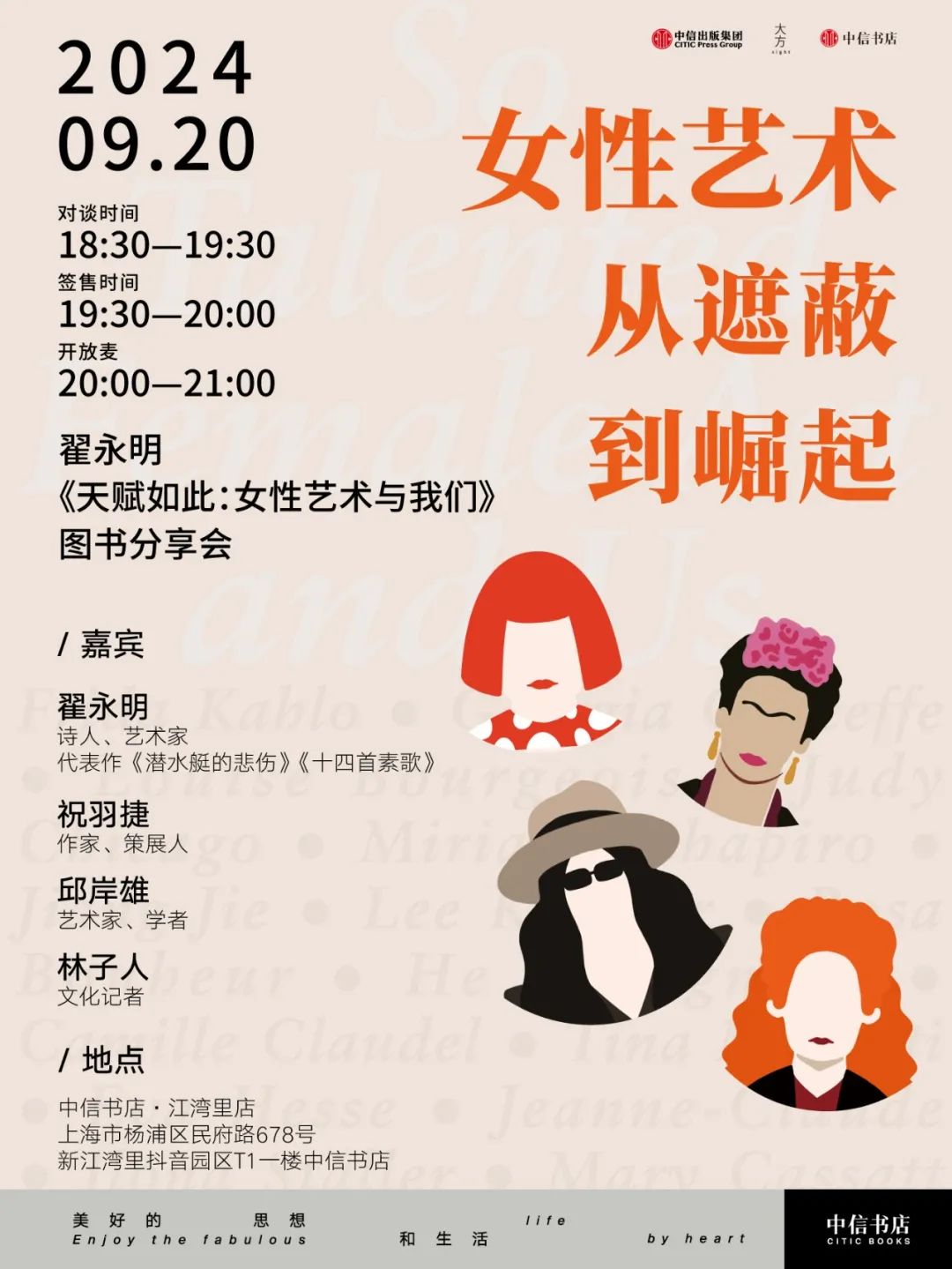 9月20日18:30,来中信书店吧,邂逅文学作者、艺术家,从那些关于女性艺术的故事中,感受她们的天赋与能量!【活动主题】