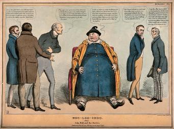 约翰·道尔绘,《何鲁朱,别名约翰牛和医生们》如何处理这个社会毒瘤,何鲁在手术时的表现给英国政治家们起到了示范效应,因为媒体塑造了一个相信科学、向往割去肿瘤、拥抱新生活的何鲁新形象。于是,何鲁温和顺从的品性和悲惨的人生遭遇被政治家借用,表述他们的政治立场。有意思的是,无论是辩论双方赞成或反对改革,政客们都能从何鲁的身上和手术中找到支持自己观点的依据。正方以为,何鲁为了成为一个“完整的男人”,可以将生命托付给医生,哪怕失去生命都在所不惜;反方则认为,正因为何鲁过于信任医生,最终失去了性命。画中的威灵顿就认为何鲁将自己的生命托付给一个鲁莽的改革者,结果是国家政体的全线崩溃。